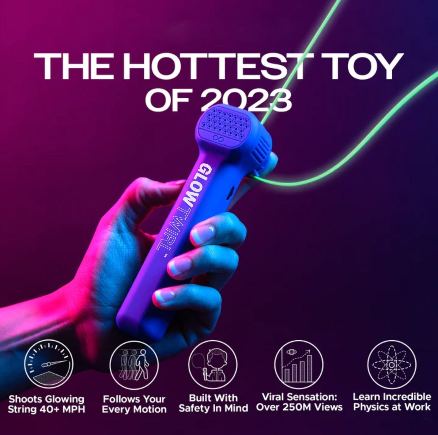 - The GlowTwirl™ HyperString Pro is an innovative toy that uses HyperTorque™ dual motors to shoot glowing strings at high speeds, creating a mesmerizing levitation effect.
